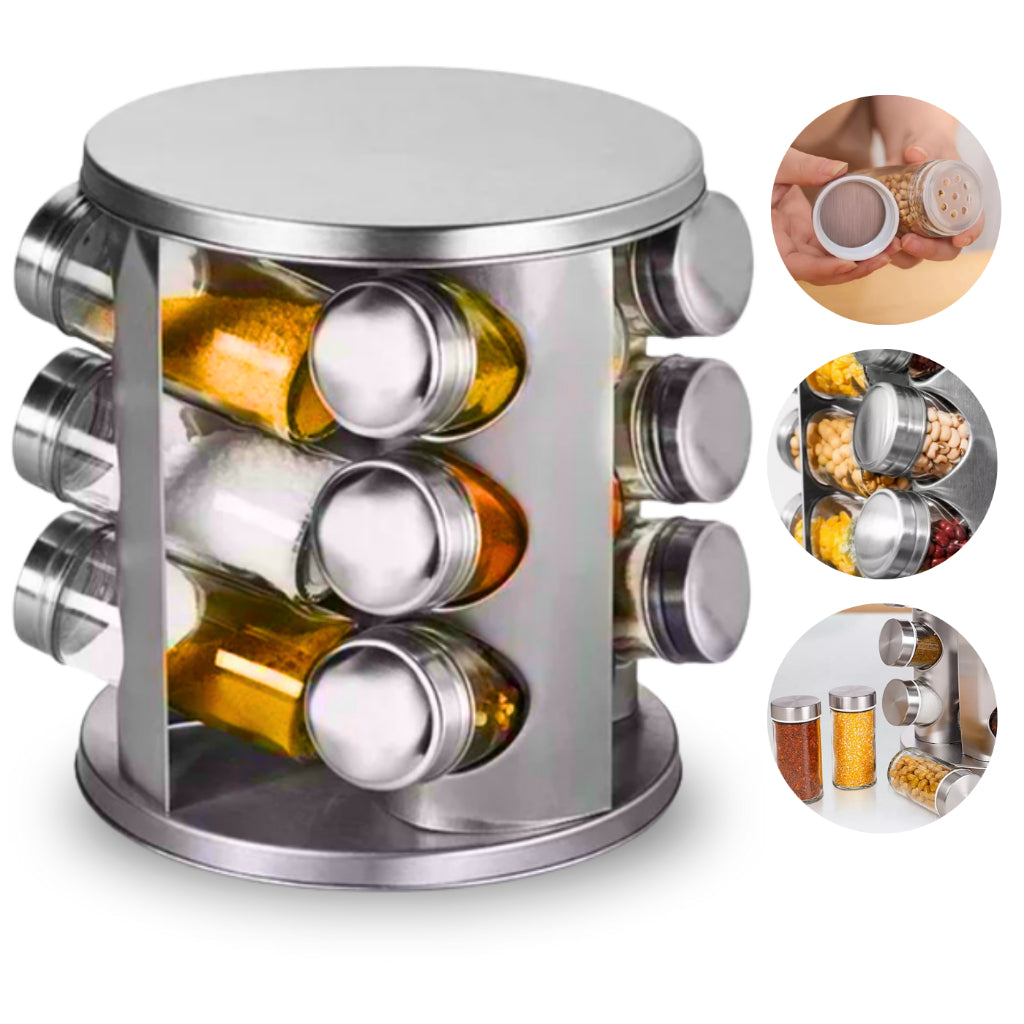 Porta Temperos e Condimentos Giratório Preto 12 Peças – Aço e Vidro