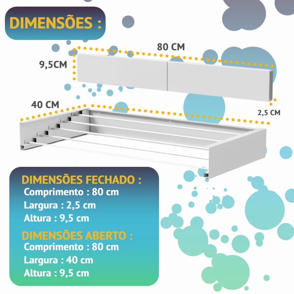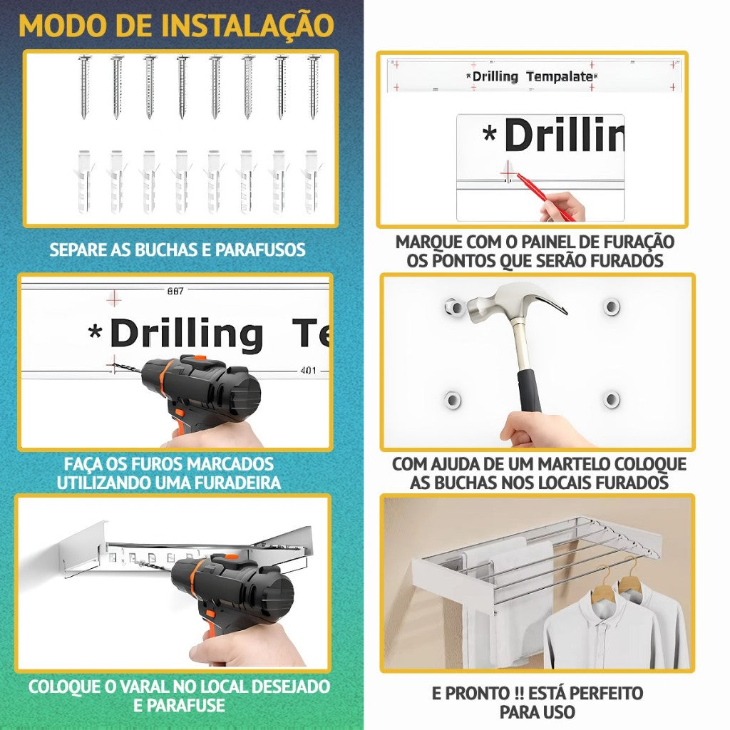 Quando está recolhido, ele fica discreto, como se fosse parte da parede. Mas, ao ser acionado, se transforma em um verdadeiro herói doméstico, salvando você da desordem de roupas molhadas espalhadas pela casa.